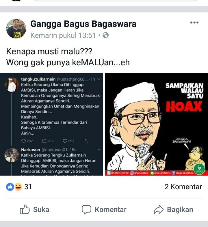“Maka dengan ini kami proses secara hukum agar tidak ada lagi yang mencoba menistakan agama islam, dan telah menghina ulama kita,” imbuhnya.