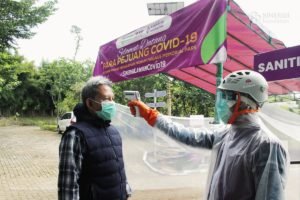 Ambulance yang baru saja tiba setelah melakukan perjalanan dari RS Rujukan Covid 19, Rumah Sakit Hasan Sadikin (RSHS) Bandung, ini memasuki booth sanitizer bertuliskan “Selamat Datang Para Pejuang Covid-19”, berhenti sejenak sambil mendapat semprotan cairan disinfektan, dan lalu melanjutkan perjalanan langsung ke area pemakaman.