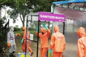 Ambulance yang baru saja tiba setelah melakukan perjalanan dari RS Rujukan Covid 19, Rumah Sakit Hasan Sadikin (RSHS) Bandung, ini memasuki booth sanitizer bertuliskan “Selamat Datang Para Pejuang Covid-19”, berhenti sejenak sambil mendapat semprotan cairan disinfektan, dan lalu melanjutkan perjalanan langsung ke area pemakaman.