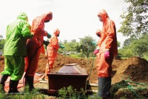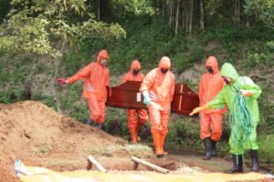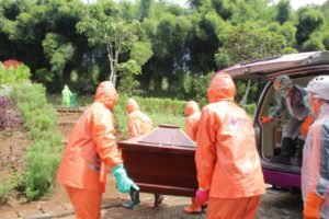 Begitu pintu ambulance dibuka, pasukan berseragam APD lengkap ini dengan cekatan mengangkat peti yang berisi jenazah covid-19, lalu membawanya mendekat ke lubang peristirahatan terakhir. Dan lantas sejurus kemudian, memasukkannya ke liang lahat. Tak butuh waktu lama, sesuai protokol kesehatan, peti jenazah kemudian ditimbun tanah.