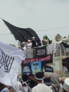 Sementara itu, salah seorang orator muda menegaskan, bendera yang telah dipertegas oleh tim kuasa hukum Hizbut Tahrir Indonesia (HTI) ini bukanlah bendera HTI, melainkan tauhid.