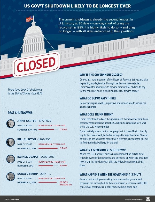 Tetapi Demokrat, yang sekarang mengendalikan Dewan Perwakilan Rakyat, menolak proposal Trump, dengan alasan tembok itu mahal dan tidak memadai untuk mengamankan perbatasan selatan. Walaupun Demokrat menguasai majelis House of Representatives atau DPR Amerika Serikat namun Republik menguasai Senat AS. DPR harus melalui Senat untuk meloloskan undang-undang apa pun, lansir Anadolu Agency Kamis (10/1/2019)